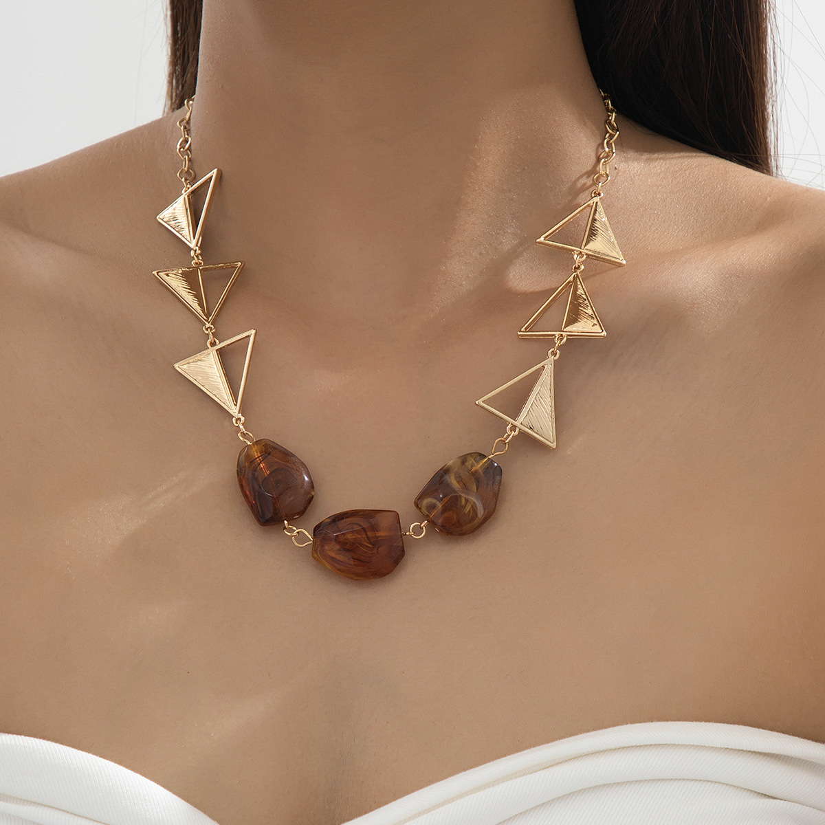 クロスボーダー新しい外国貿易ジュエリー幾何学的な金属中空三角形ブラウン不規則な樹脂ペンダントレディースネックレス