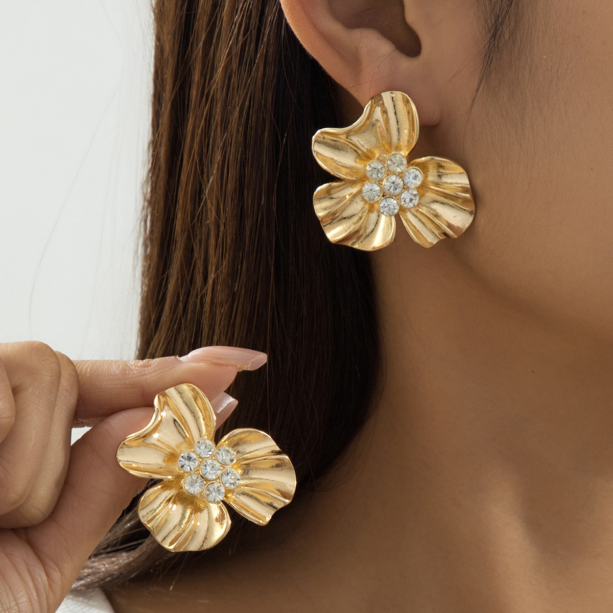 日本と韓国のシンプルなデザインのゴールドダイヤモンドフラワーイヤリング、多用途の不規則な花びらイヤリング、卸売