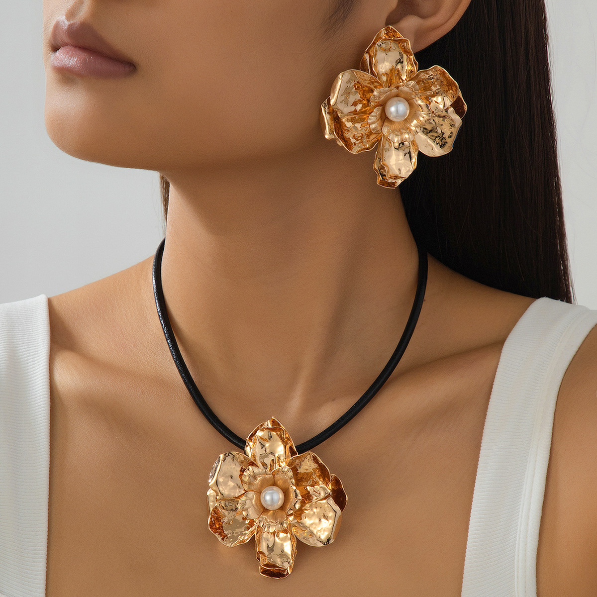 欧米のクロスボーダーの個性は誇張して金属の立体のしわの大きい花のネックレスのイヤリングの復古の花卉のアクセサリーのスーツの女性を誇張します。