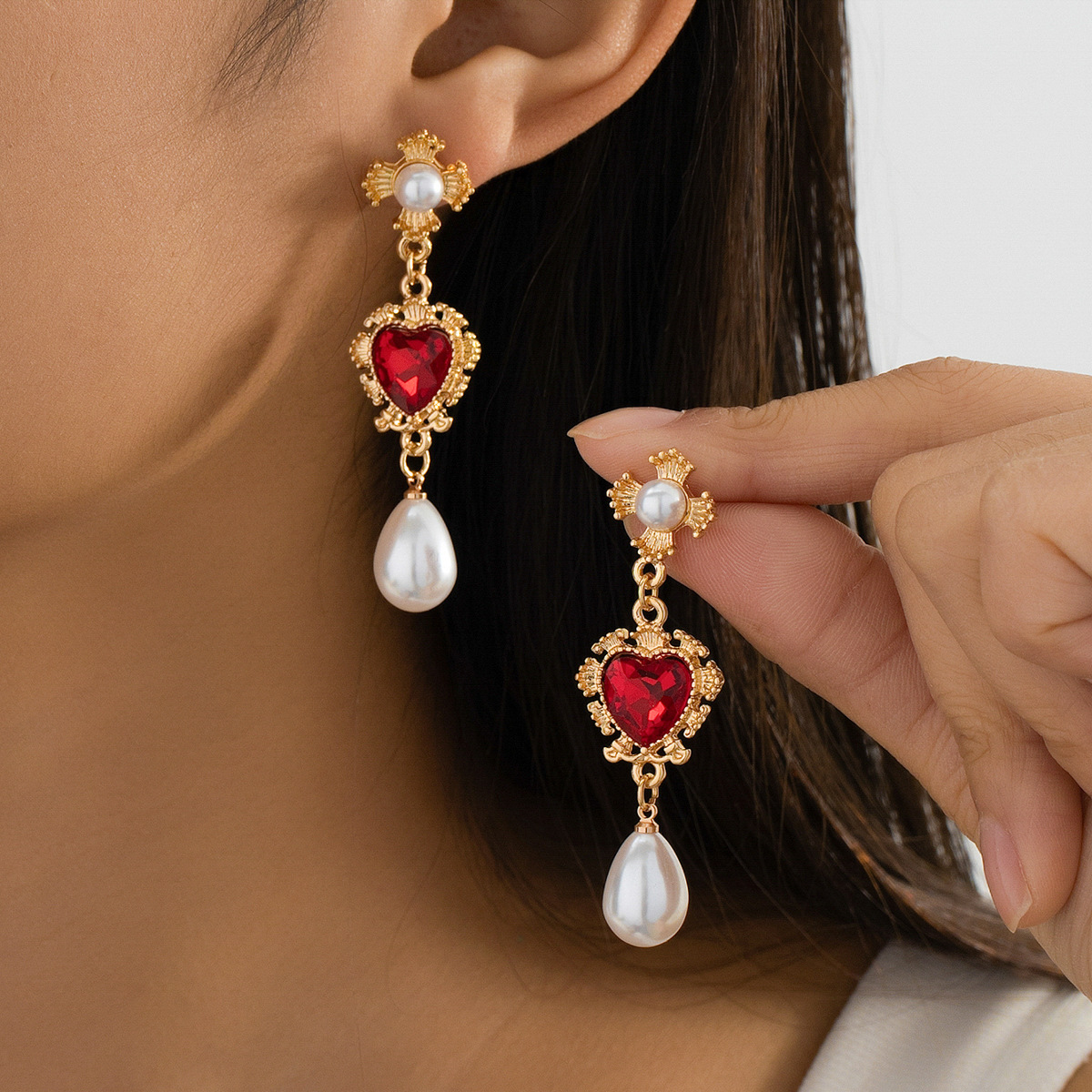フレンチレトロな宮殿スタイルの赤い愛のジルコンイヤリングロングスタイルパールタッセルイヤリングハイエンドジュエリー