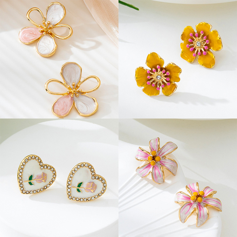 2025 新しい夏の森スタイルの小さな新鮮なダイヤモンドがちりばめられたオイルドロップフラワーイヤリング気質ラブローズイヤリング卸売