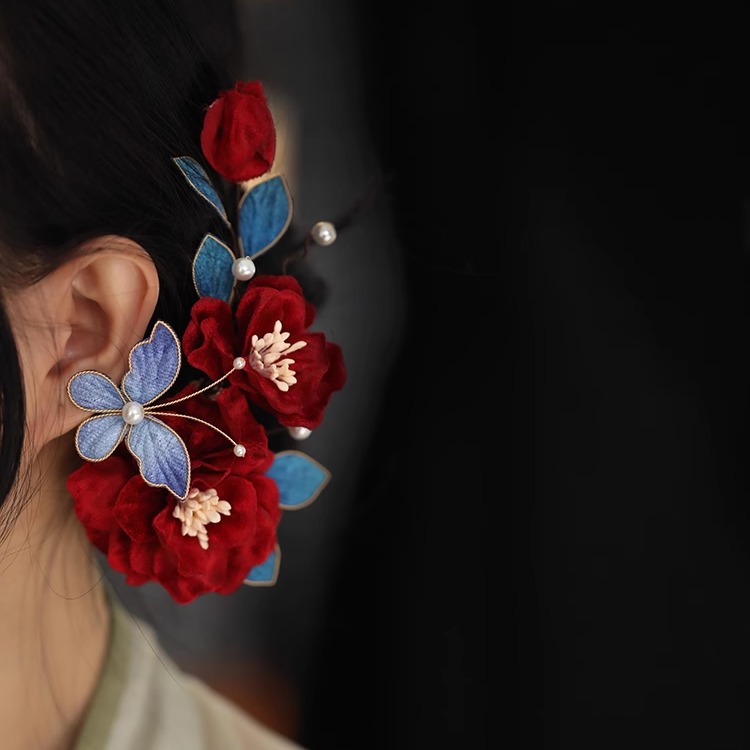 レトロな赤いローカット古代スタイルのチャイナドレスヘアアクセサリーQinghan女性の蝶のヘアピンサイドブライダルヘッドドレス