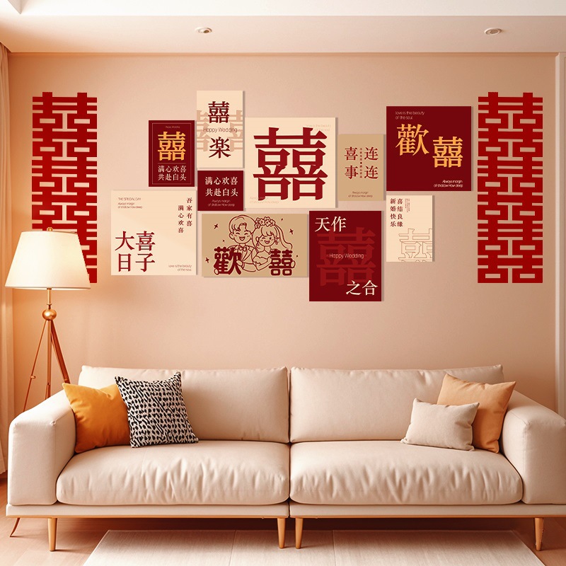 結婚式の部屋のレイアウトセットリビングルーム結婚式の装飾寝室ベッドサイドハッピーボード結婚式の男性と女性のソファ背景壁