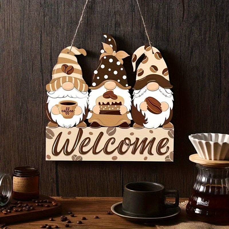 国境を越えたコーヒーは木製のペンダントの小人が表札の田舎の玄関をぶら下げているのを歓迎します。