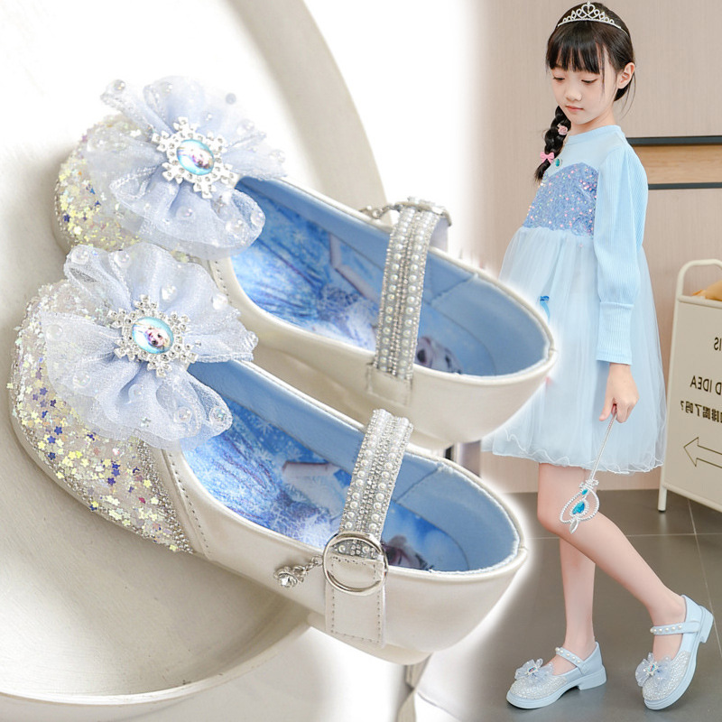 子供靴女の子革靴春と秋 2025 新しいエルザクリスタル靴リボン女の子ベビーソフトソールプリンセスシューズ