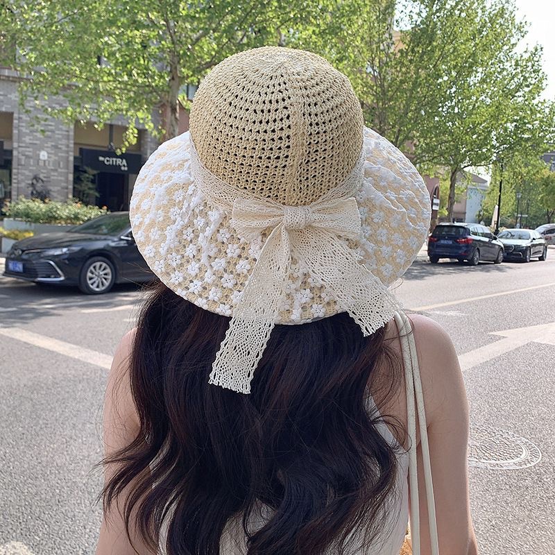 麦わら帽子女性の新しいスタイル織りフレンチレース小花休暇大きなつば日よけ帽子海辺のビーチ帽子日よけ帽子