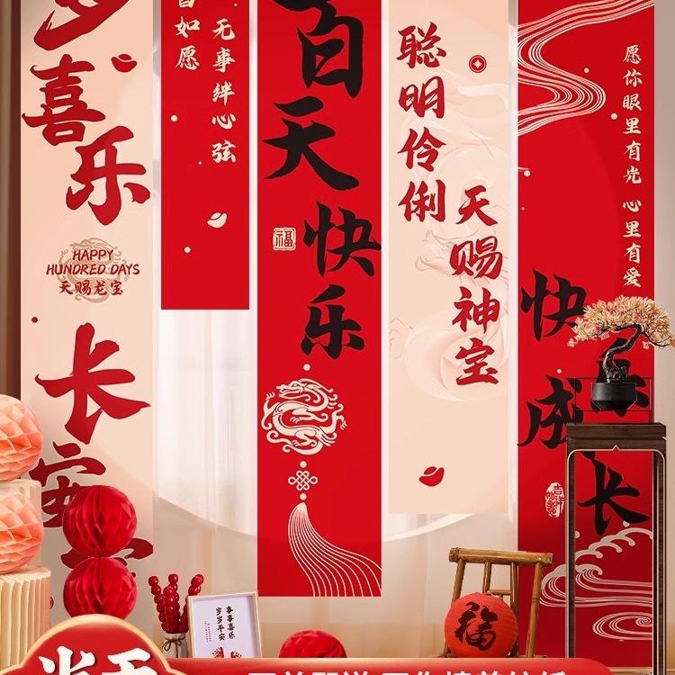 ドラゴンベビー満月百日宴会シーンレイアウト男の子と女の子新しい中国風のバナー装飾背景壁小道具