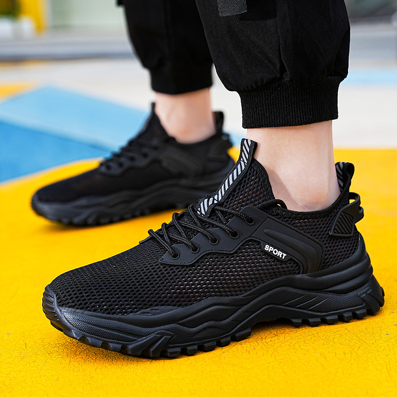 クロスボーダーの大きいサイズの新しい男性の靴の黒色のネットの通気性の運動靴の柔らかい底の軽いランニング靴の男性のカジュアルな靴