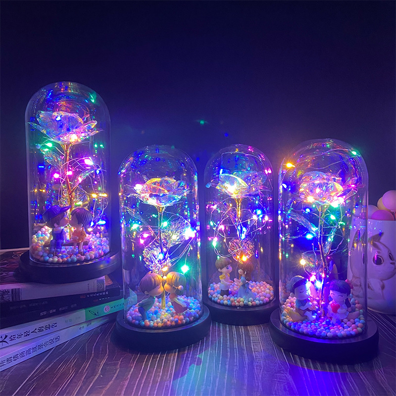金箔玫瑰花玻璃罩led发光玩偶款永生花七夕520情人节礼物创意摆件