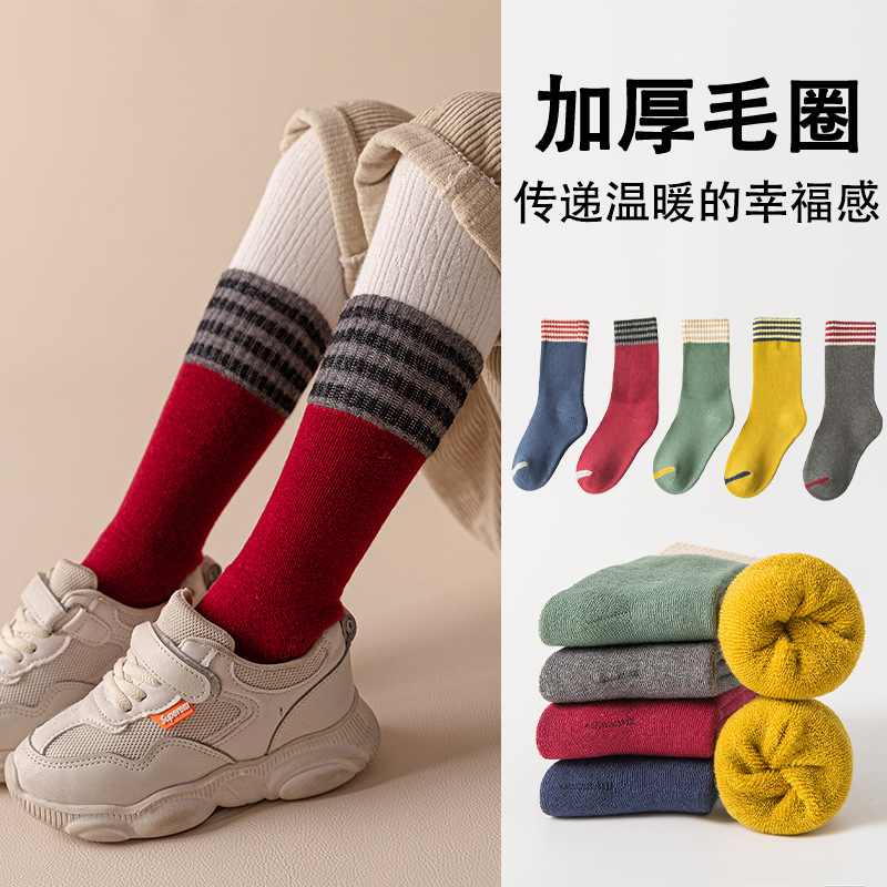 儿童袜子秋冬加厚保暖毛圈袜纯色涤棉男女童高长筒地板宝宝袜批发