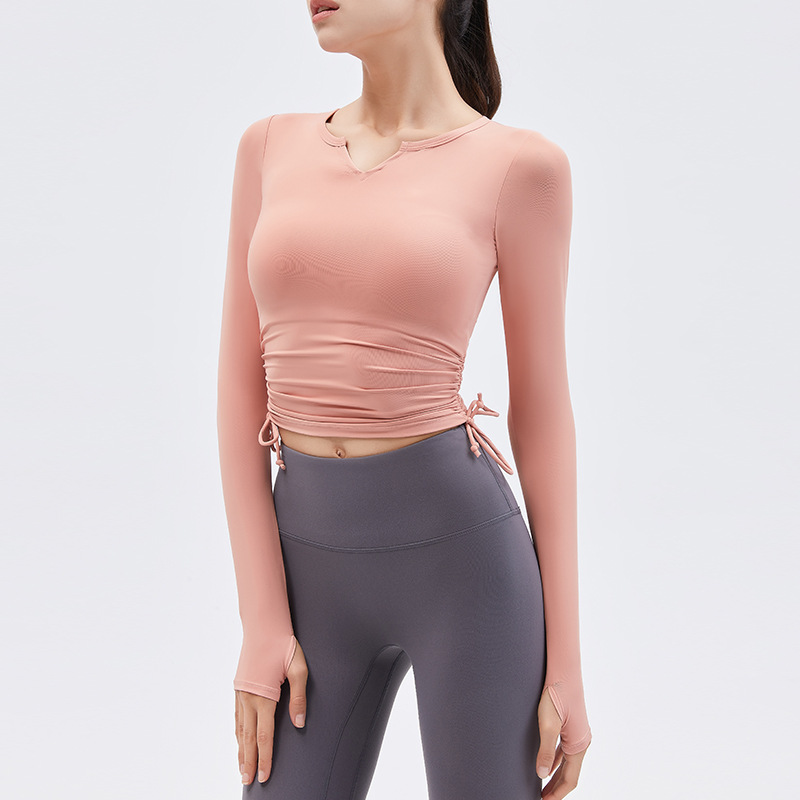 2023新款欧美健身上衣女V领裸感紧身显瘦抽绳瑜伽服跑步运动长袖