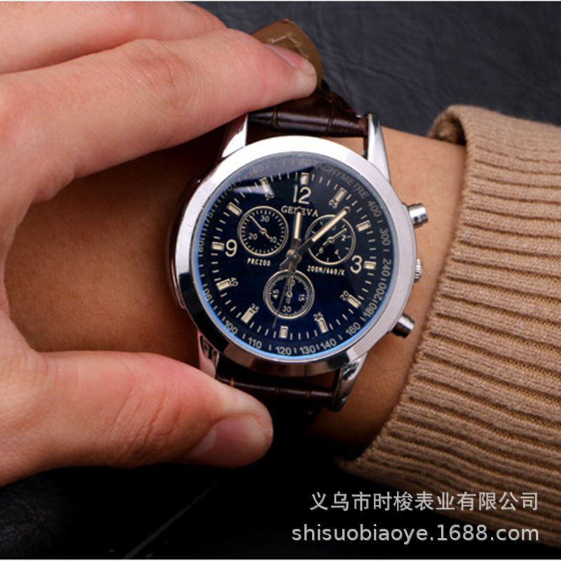 よく売られているブルーレイガラス装飾偽三眼ベルト腕時計微商贈答品カジュアルファッション男女腕時計