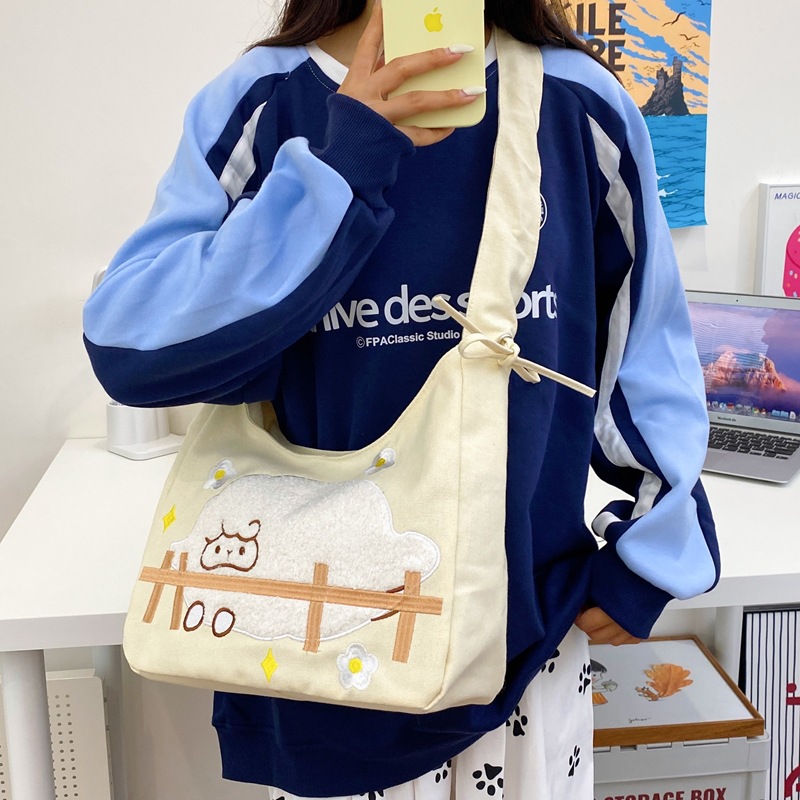 日本のかわいいアニメの子羊のキャンバスバッグの女性2024の新型の大容量の肩の斜め掛けのバッグの学生の手提げ袋