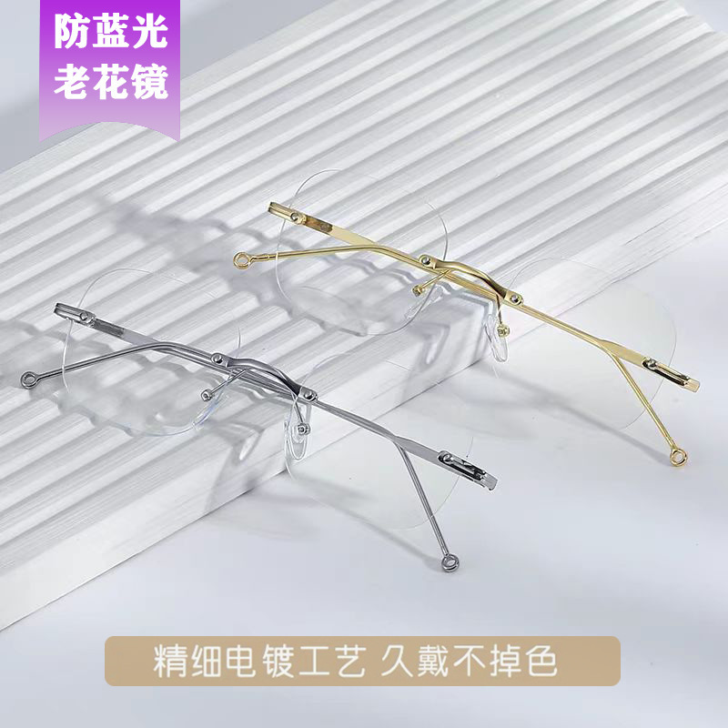 女性用老眼メガネ 2025 新しい高精細抗青色光中高年ファッションリムレスダイヤモンド老眼鏡エッジカット