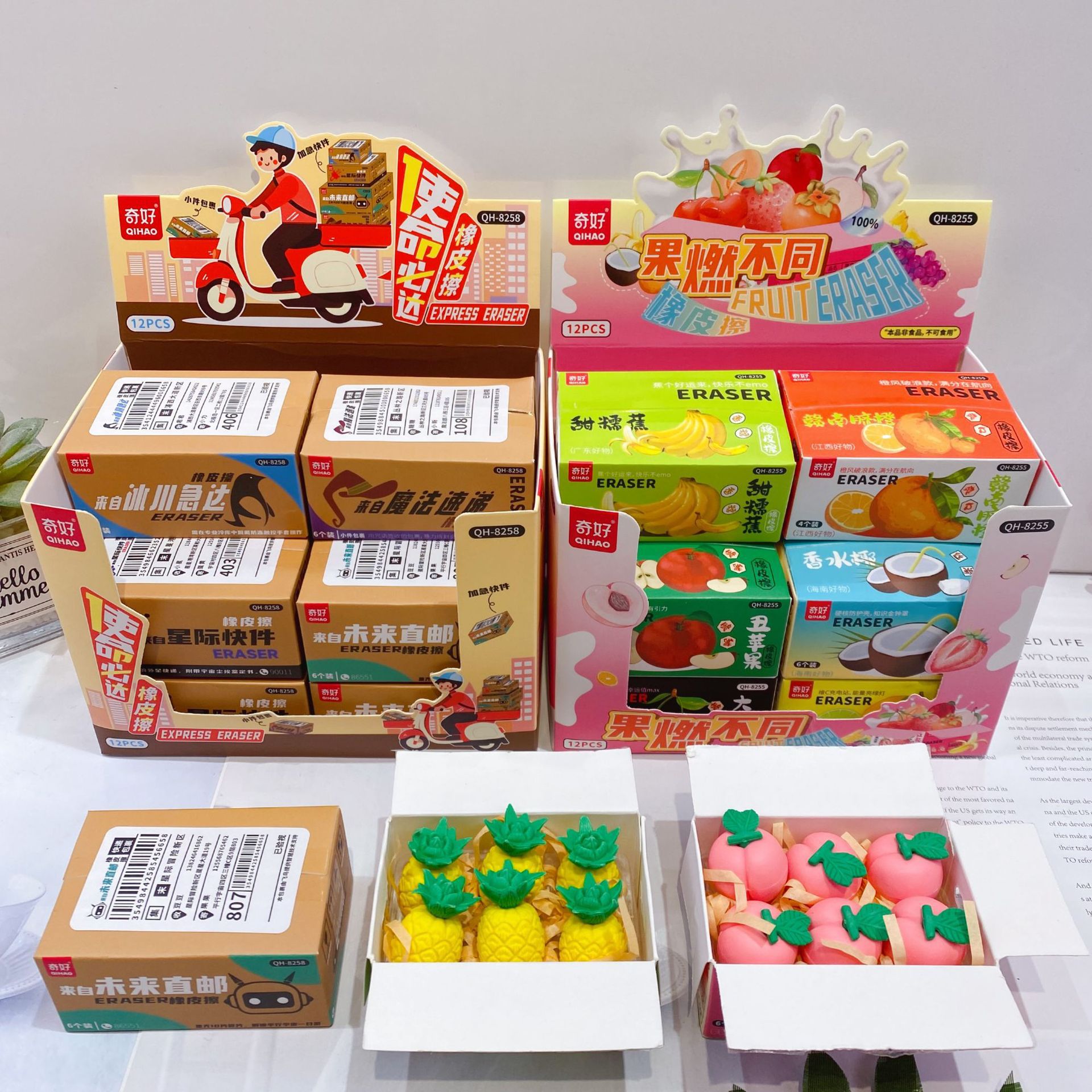 新しい模擬フルーツ消しゴムセット、かわいい速達パッケージ、楽しい形の消しゴム、ブラインドボックス、拭いてきれいにします。
