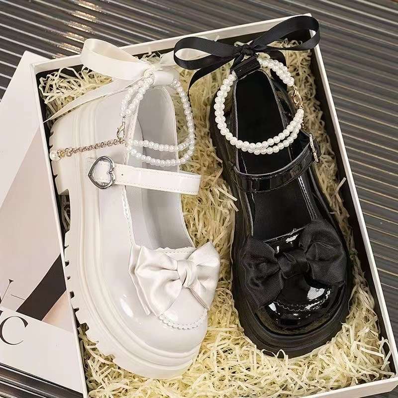 パールスモールレザーシューズ夏の新作メリージェーンシューズ2025太いヒール学生靴厚底スカート付きプリンセスラウンドトゥ
