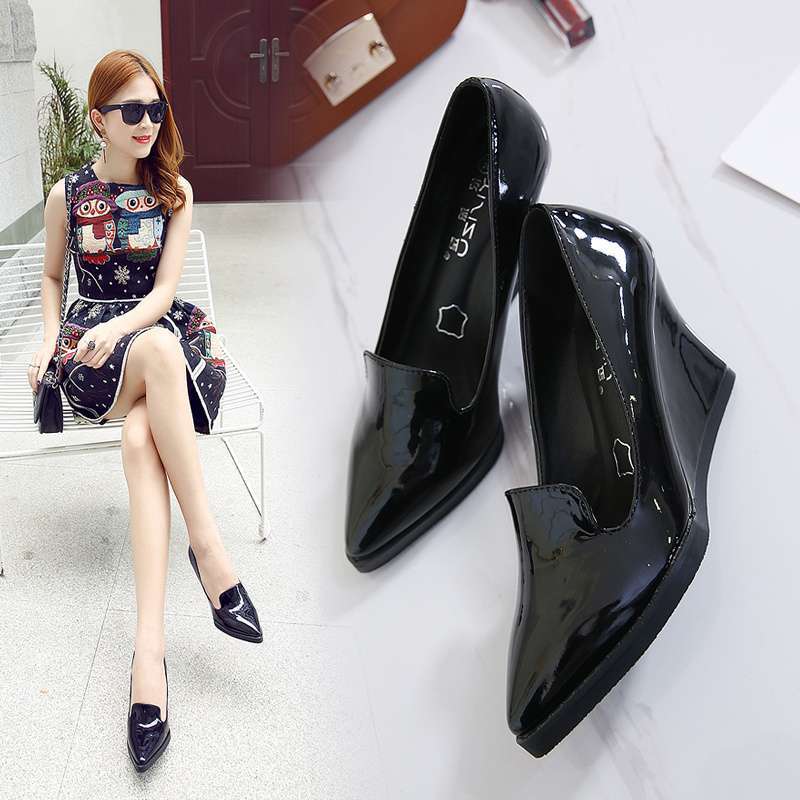 ハイヒールの黒い坂と職業靴の快適な柔らかい面の小さい革靴はホテルの中で柔らかい底の仕事の靴の女性と一緒にいます。