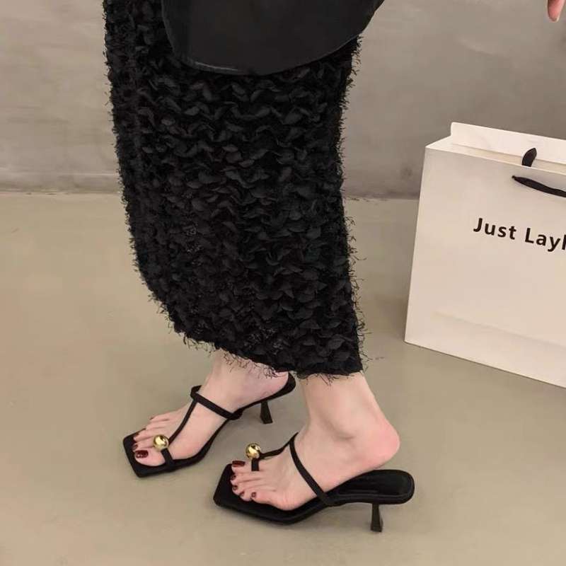 フレンチブラックハイヒールビーチサンダルレディースアウターシューズ2025夏スカートサンダルニッチサンダル