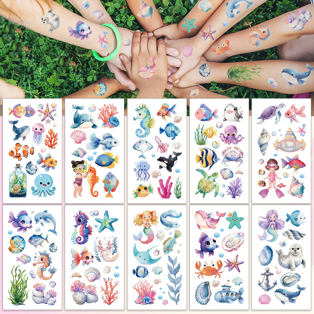 10枚の国境を越えた新しいアニメ海底世界動物のタトゥーは子供のおもちゃのパーティーのプレゼントの顔を貼っている