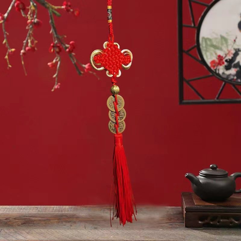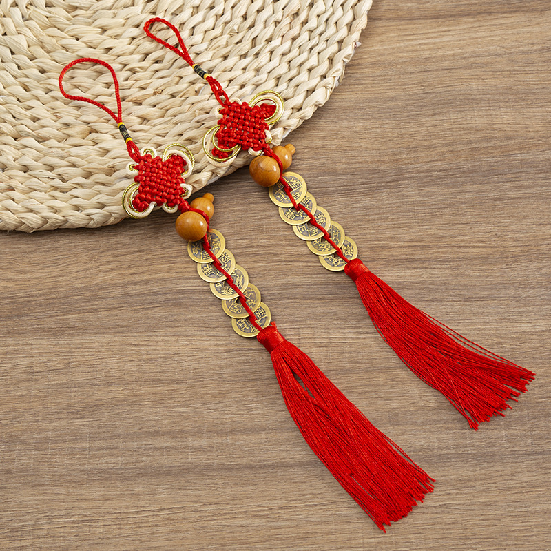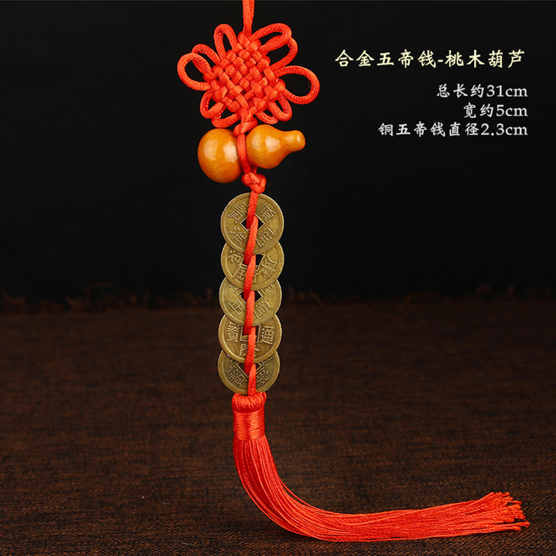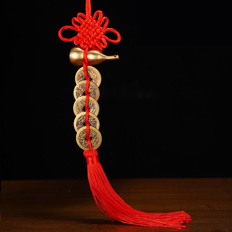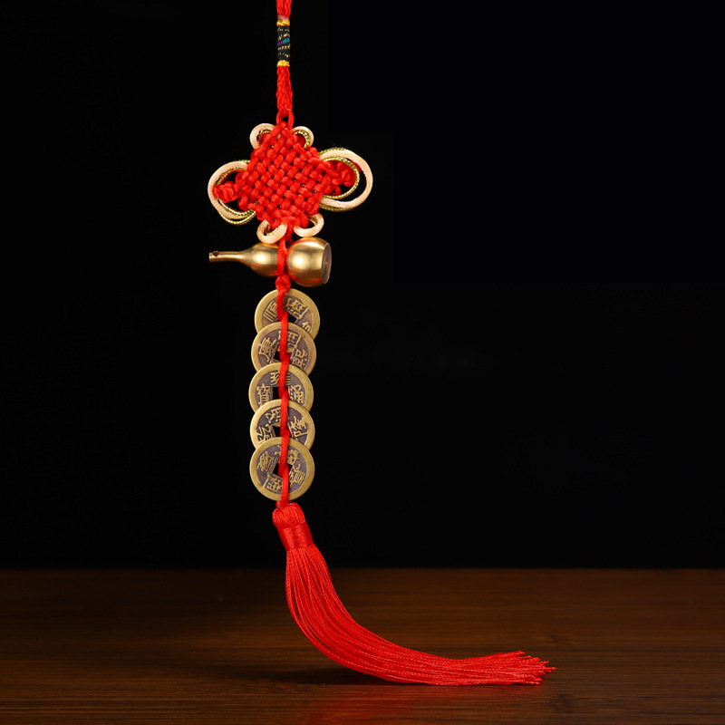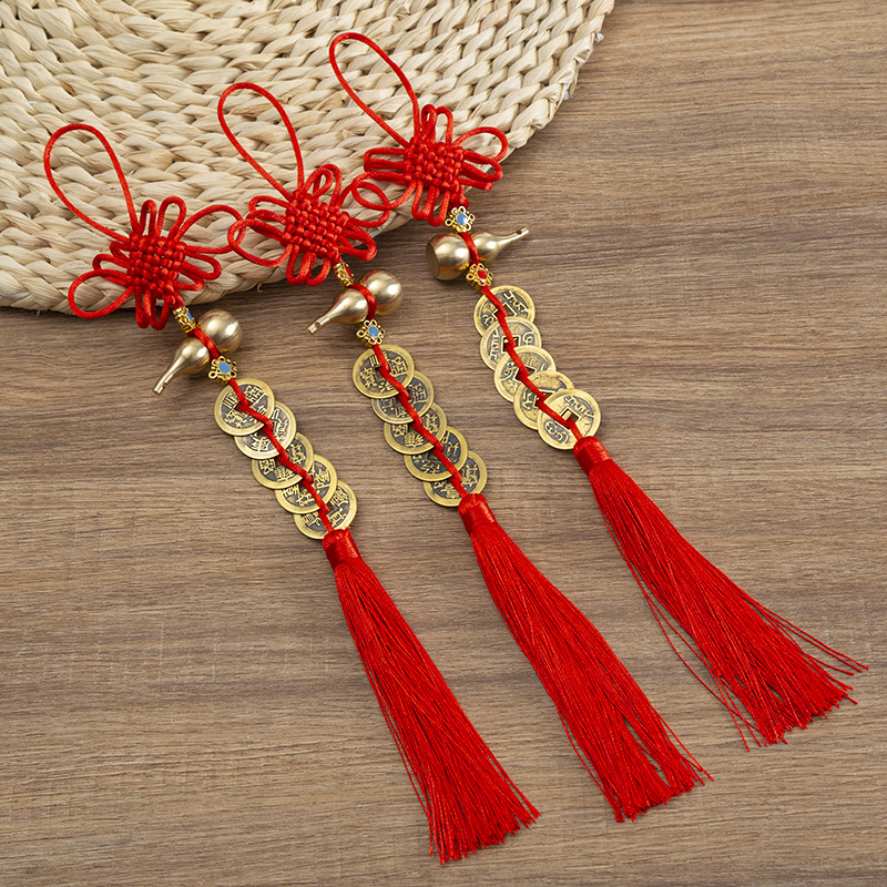 中国結富貴結流蘇五帝銭車ストラップ純銅三帝銭銭家住宅風水ストラップ
