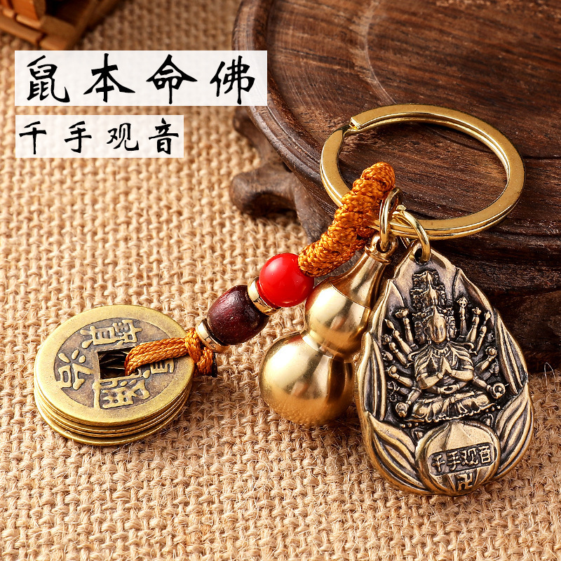 黄銅の八大守護神のペンダントはカップルの自動車のキーホルダーを飾って、銅のヒョウタンは砂の黄色の縄の五帝のお金を持って飾ります。