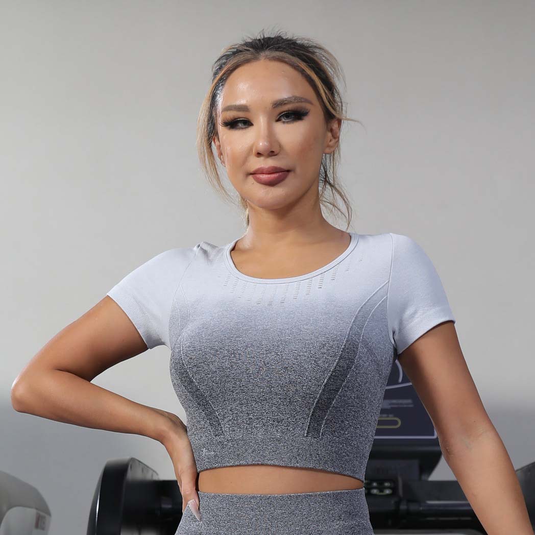 【加工カスタマイズ】ヨーロッパとアメリカンスタイルのグラデーションウエストショートTシャツトップヨガウェア
