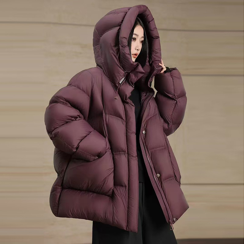 高級感のあるダウンジャケットの女性2024冬には、パフ感が厚く、帽子もゆるい白鴨パイルの大型パン服のコートがついている