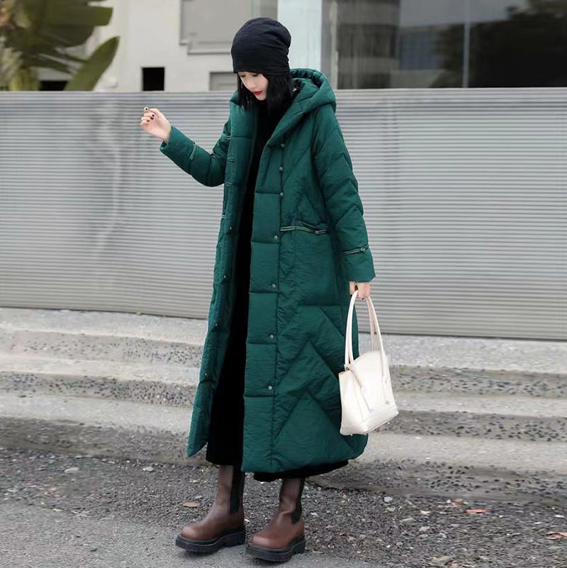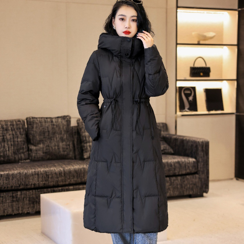 腰の長いダウンジャケットの女性2024冬のファッションは帽子と贅沢で暖かい膝の白いアヒルのベルベットが痩せているコートが湿っている