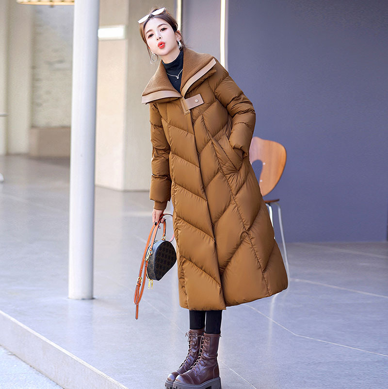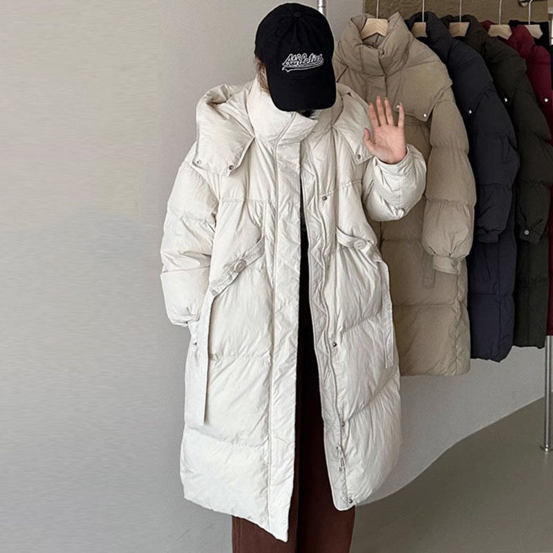 ヨーロッパ商品のロングタイプの白鴨ダウンジャケットの女性2024冬のファッションデザイン感が漂っています。