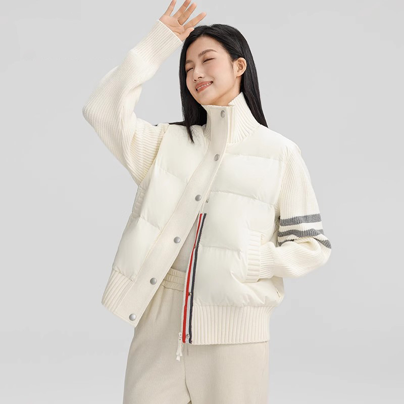 ニットは軽薄なダウンジャケットの女性2024冬のファッションは色の縞の立襟のカジュアルな白鴨のベルベットのコートにぶつかった