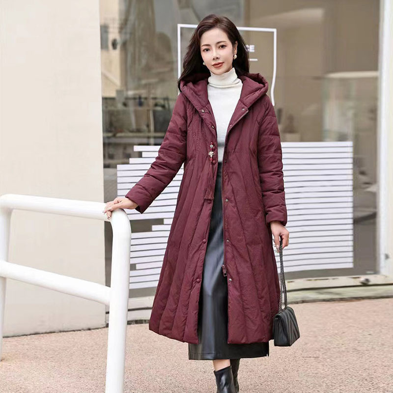 国風の長いタイプの白鴨の羽毛ジャケットの女性2024冬の復古刺繍は厚い膝を越えて大きいサイズのコートを掛けます。