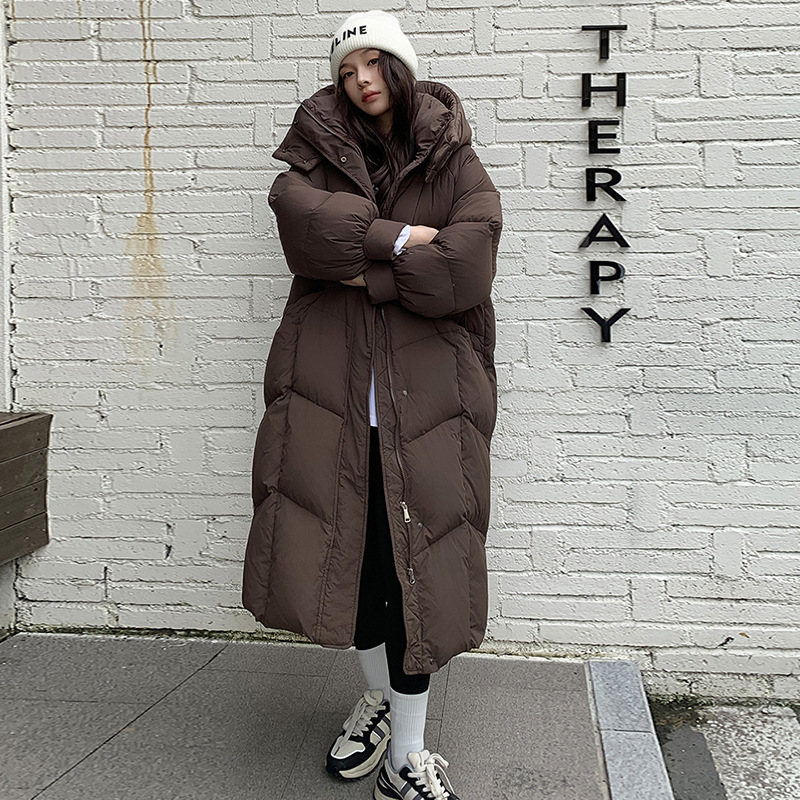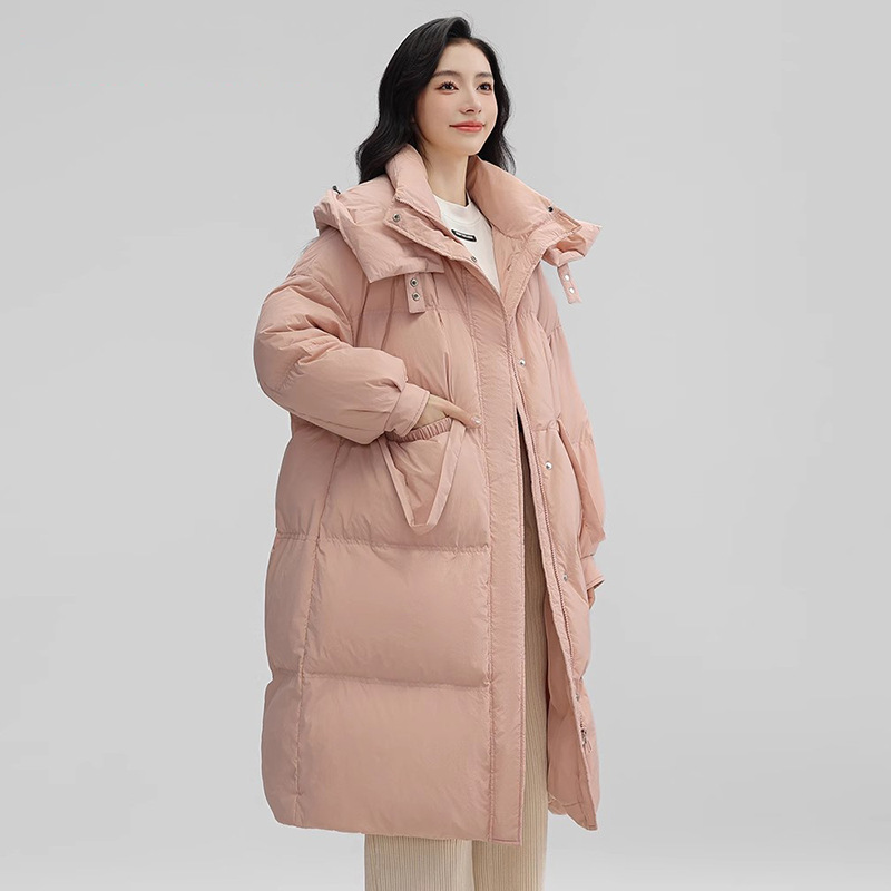 帽子付きの長い布団ダウンジャケット女性2023冬の新型ファッションは、ゆったりとした保温白鴨パイルコートを厚くする