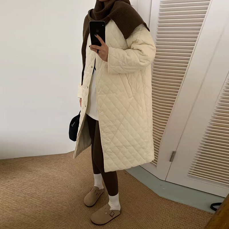 マフラーの長いダウンジャケットの女性2023冬の新型の厚い甘さの韓系のゆったりした菱格の保温は膝のコートを過ぎます。