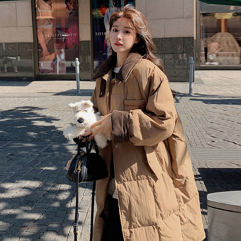 90白鴨絨毛衝突色長型ダウンジャケット女2023冬ファッション洋風コーデュロイ襟膝コート潮