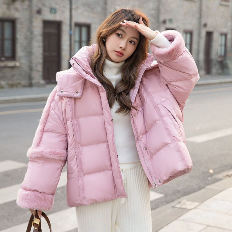 ミンクの毛は短いダウンジャケットの女性2023冬の新しいファッションをつなぎ合わせて、帽子のゆるい小柄なコートを厚くします