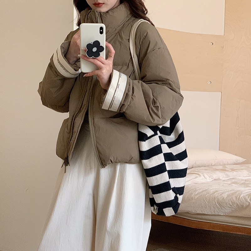 色合わせの袖のダウンジャケットの女性のショートタイプの2024冬のファッションの立襟のデザイン感の保温の白いアヒルの絨毯の小さい背のコート
