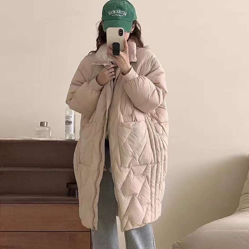 90白鴨絨毛長型ダウンジャケット女2024冬の新型ファッション立襟ツイル模様保温膝コート潮