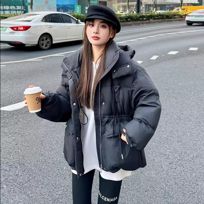 韓国版のスタンドカラーのダウンジャケットの女性のショートタイプの2024冬の新型の厚い保温白鴨の毛の大きいポケットのパンの服のコート