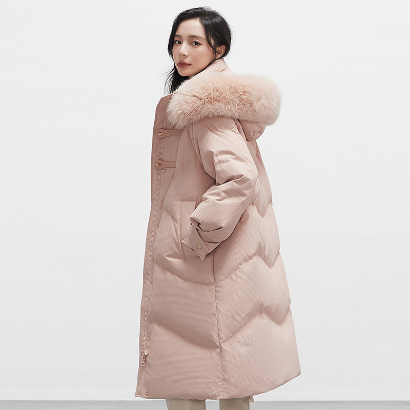 ロングタイプの白鴨毛ダウンジャケット女性2024冬ファッションは帽子付きのゆるい保温大布団カップルコートを厚くした