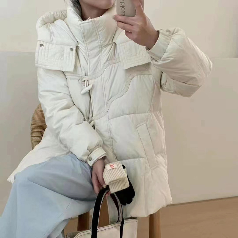 牛の角のボタンの中の長いタイプのダウンジャケットの女性の2024冬の新型のファッションの甘い帽子が見えます。