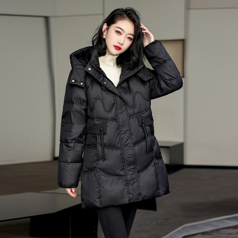 おしゃれな厚手ダウンジャケット レディース ミドル丈 2025年冬新作 フード付き 暖かい白アヒルダウンジャケット 大きいサイズ