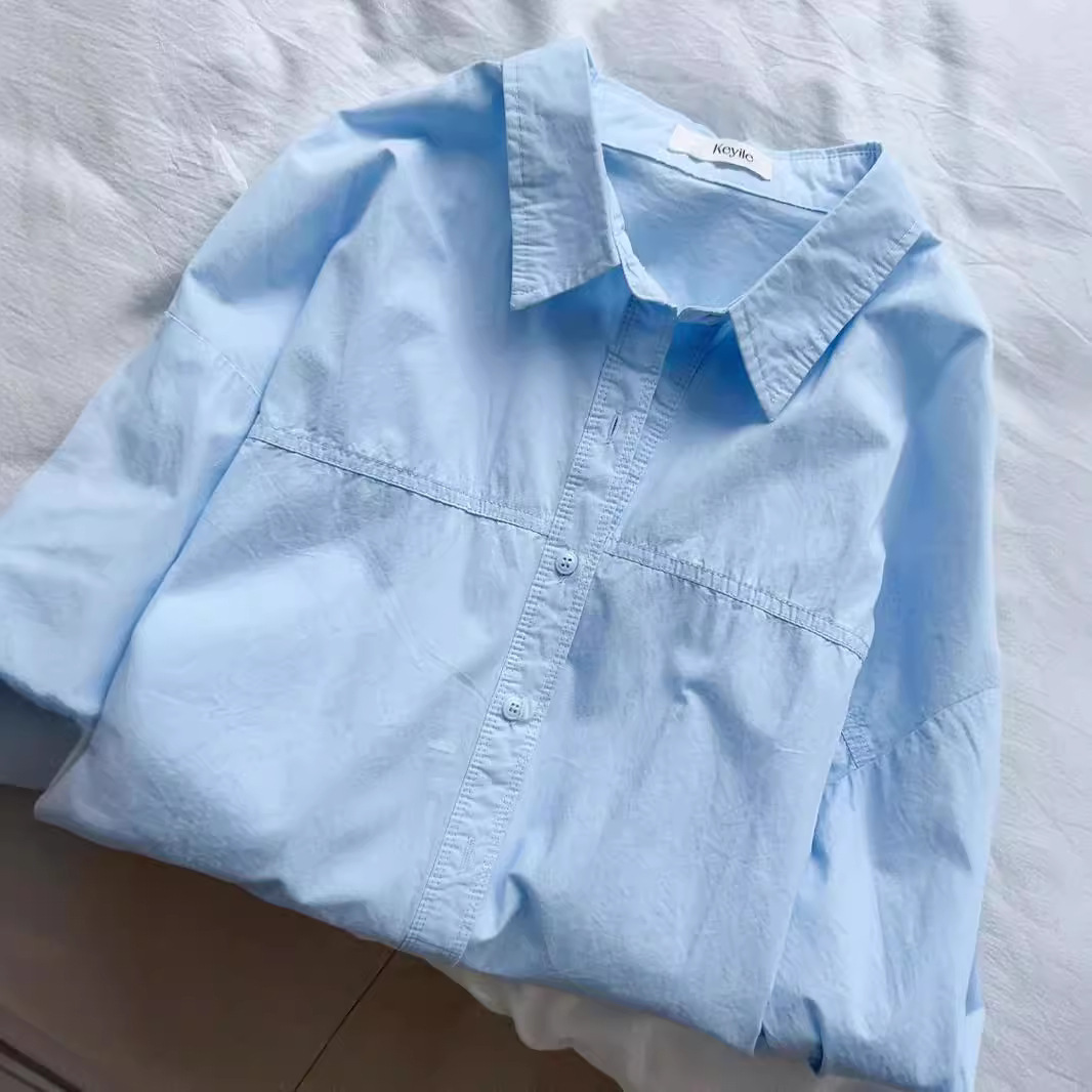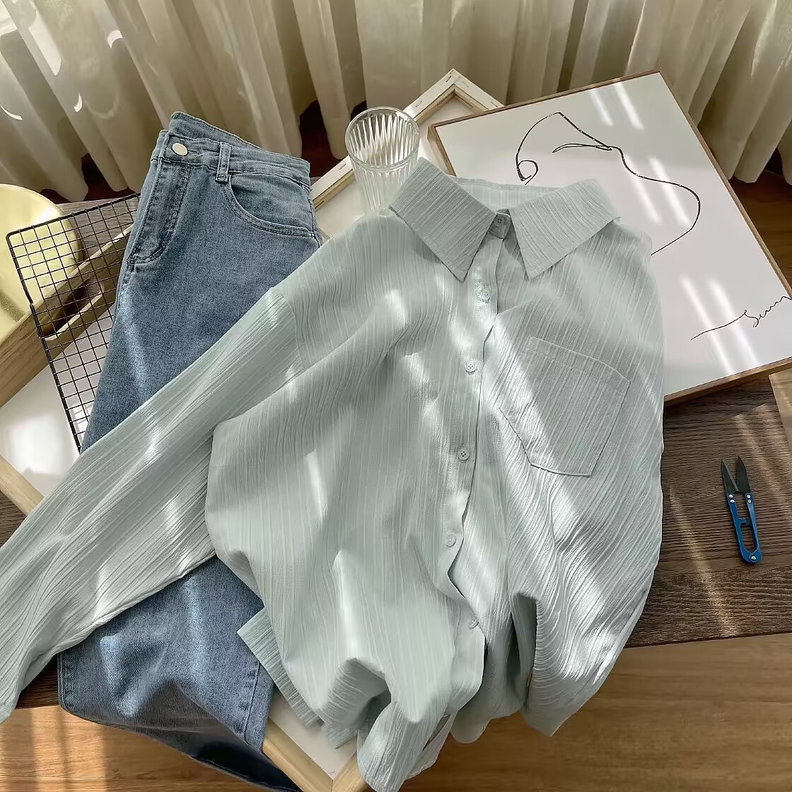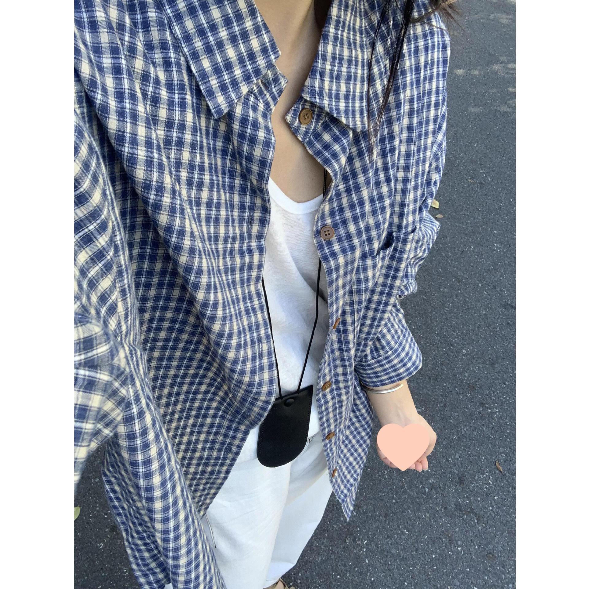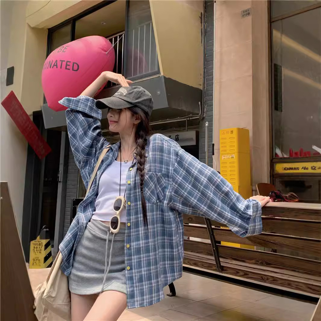 青い格子のシャツの女性の2024秋の韓国系のゆったりしたカジュアルなレトロなシャツの長袖の日焼け止めの上着のコートは薄いです。