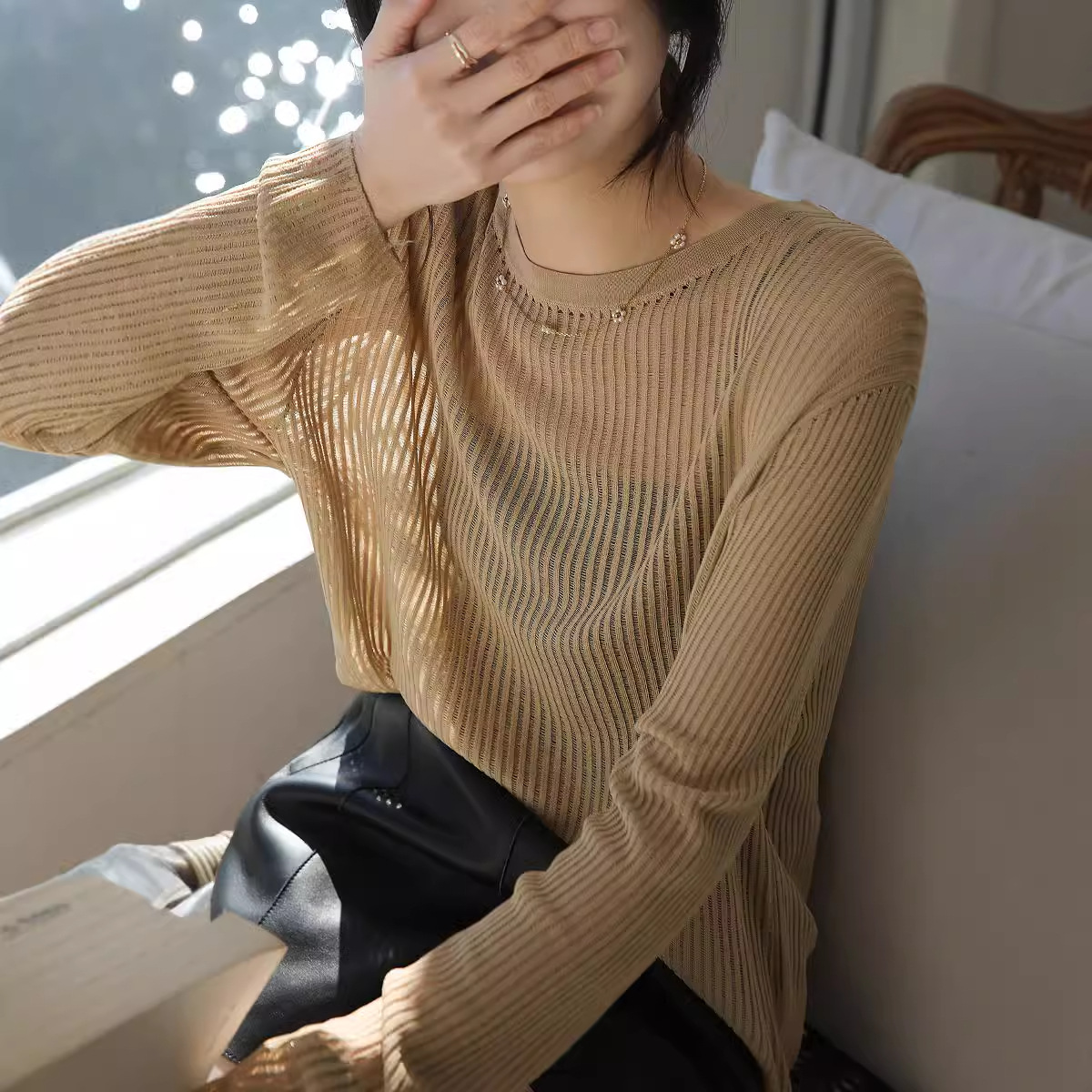 2024春と秋の穴のストライプの透かし彫りの怠惰な風のシンプルなカジュアルなニットの女性の丸首の長袖の肩の日焼け止めのブラウス