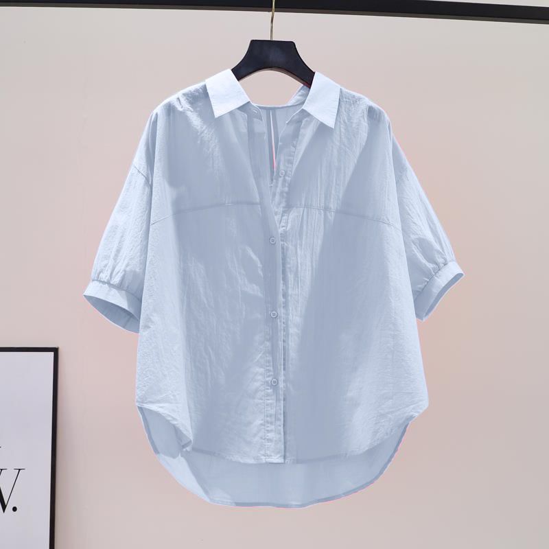 綿のシャツの女性の半袖の2025夏の新型の韓国版は襟をひっくり返してゆったりしています。