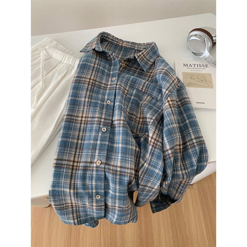 小紅の本の爆発の青い毛の格子のシャツの女性の春秋の韓国版はゆったりしていてやせているpolo襟のカジュアルなシャツを現します。