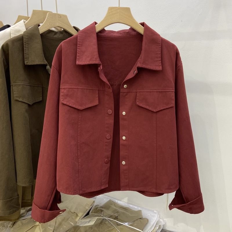 2024秋の新しい襟のカジュアルな短いタイプの怠惰な長袖のコーヒー色の水洗い風のシャツの薄いコートの女性
