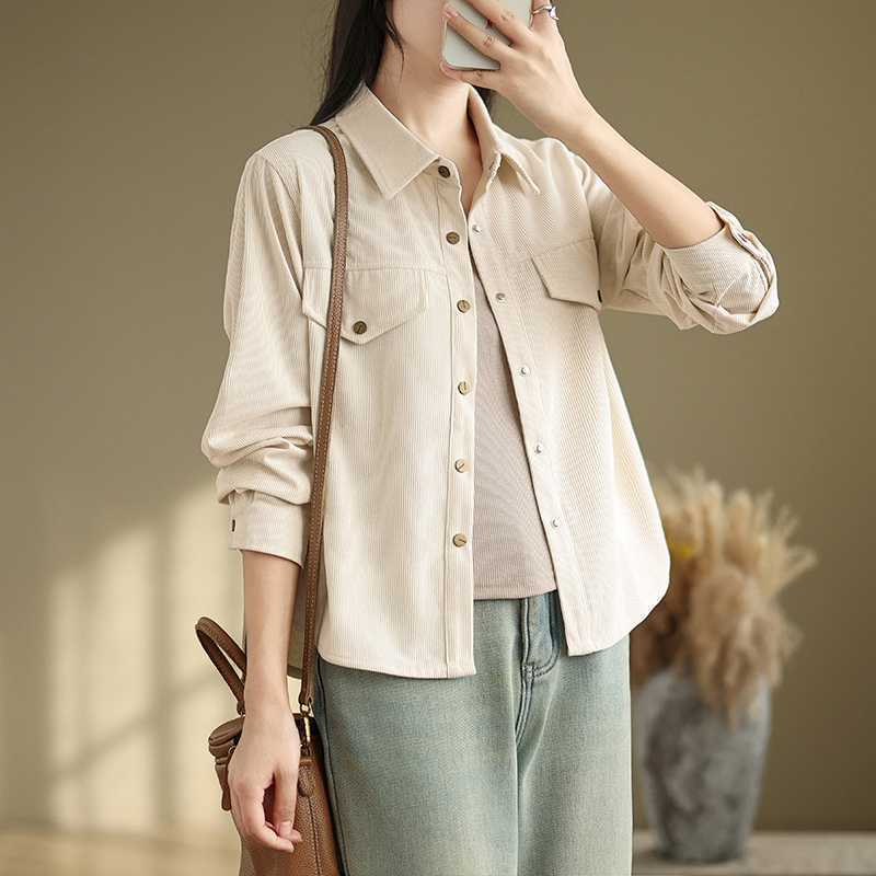 2024秋冬新作ファッション文芸百合長袖シャツコーデュロイストライプカジュアル通勤シャツコート女性