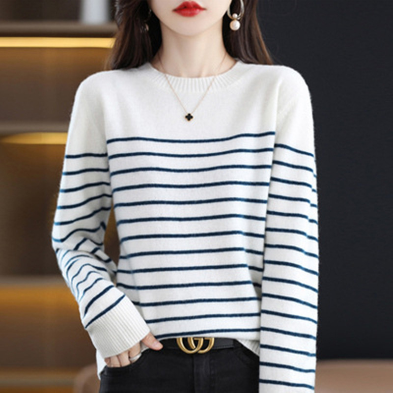 秋冬のゆったりしたセーターの女性のストライプのニット服