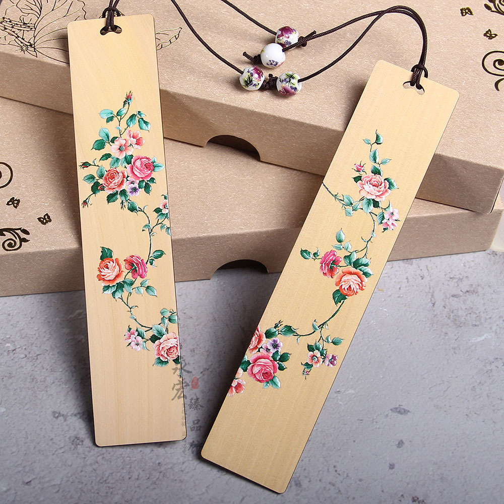 色絵の黄楊の木のロマンチックな薔薇のしおりのバラのしおりの田園の風文は贈り物を作って字のlogoを刻むことができます。