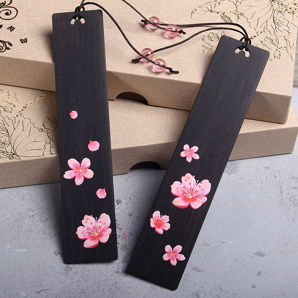 桃の花のしおり黒檀色絵桃のしおり古風プレゼント木製しおり彫刻ロゴ